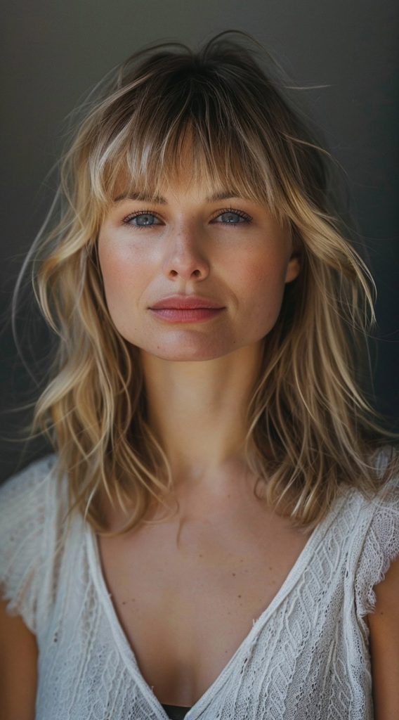 10. Medium-Length Shaggy Cut with Side Bottleneck Bangs Ideal for Round Faces