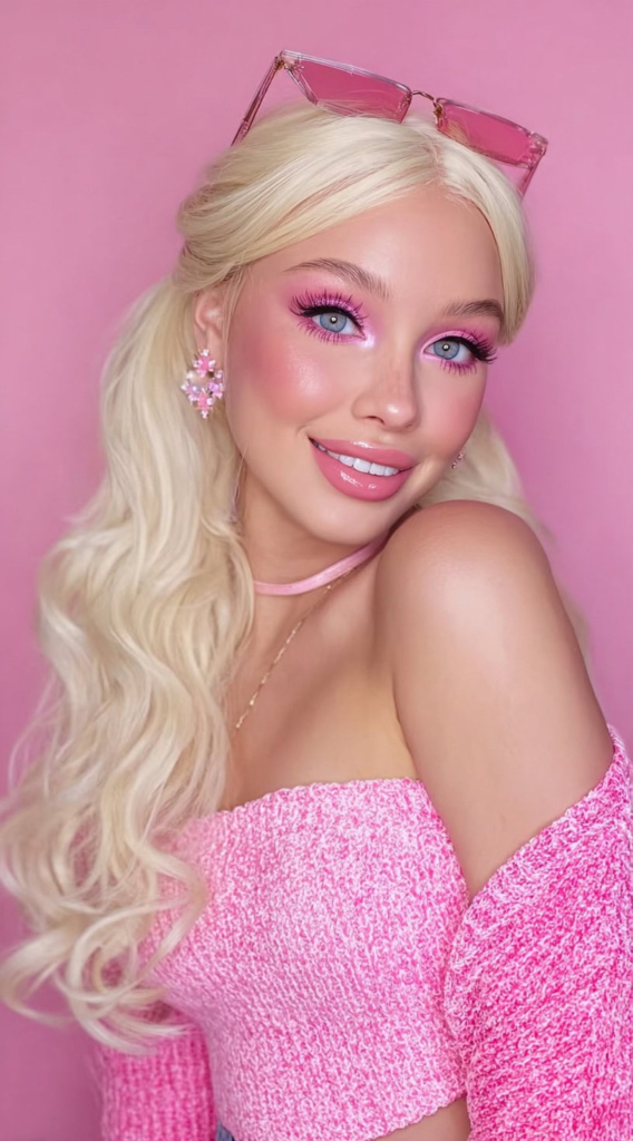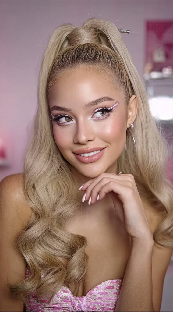 Around 40% of Halloween hairstyles now mix glam with edgy elements. Combining soft curls with darker makeup creates a strong contrast while keeping the Barbie theme.