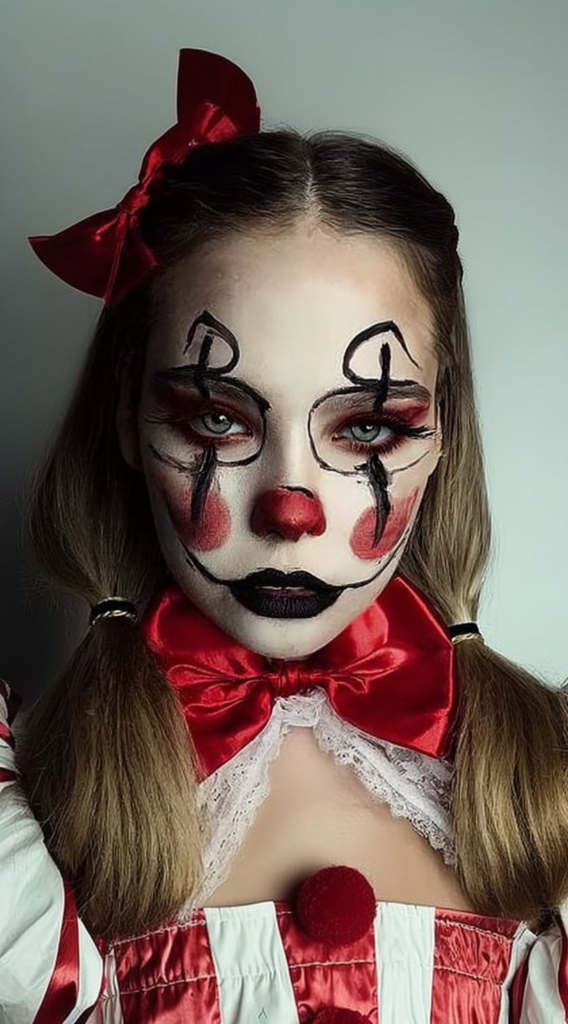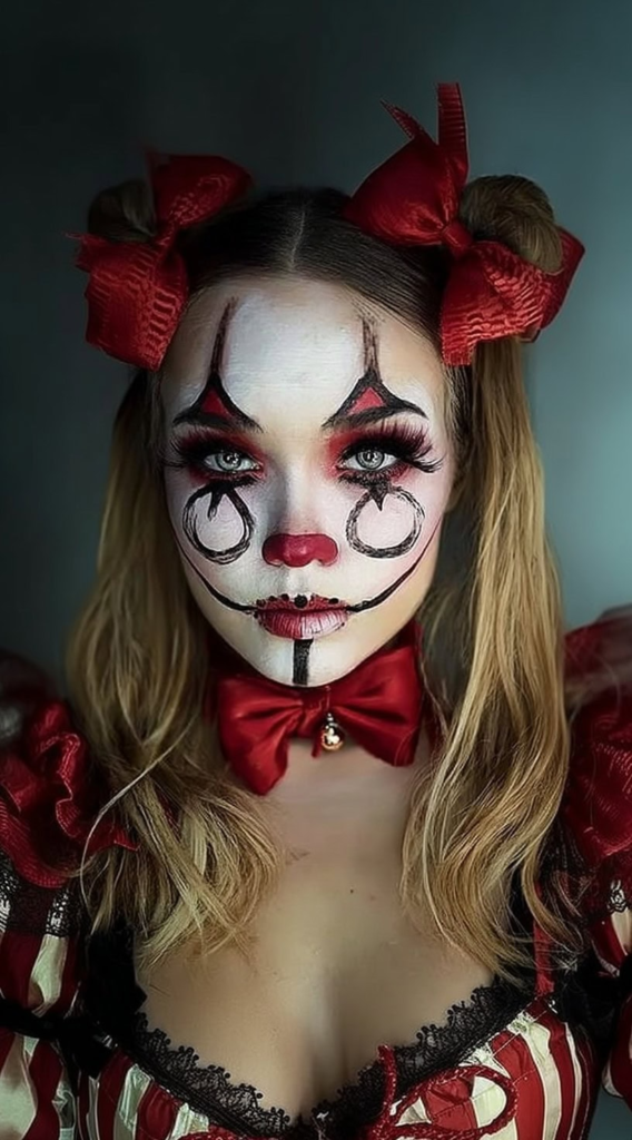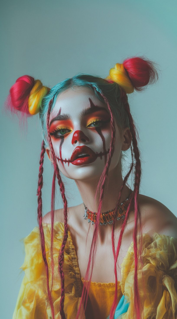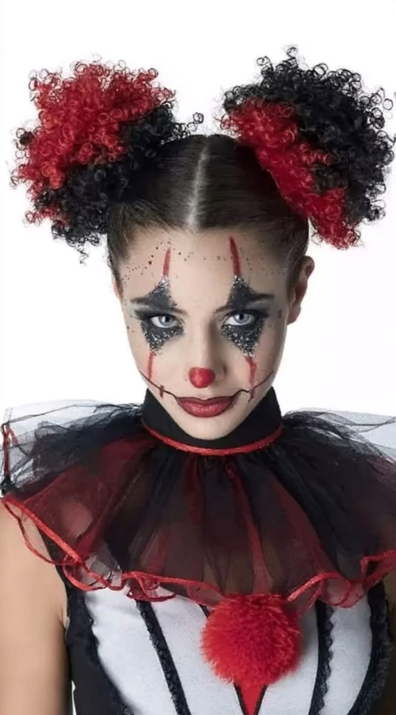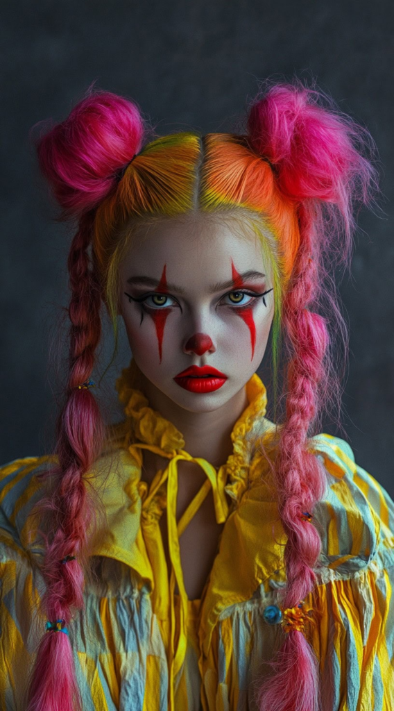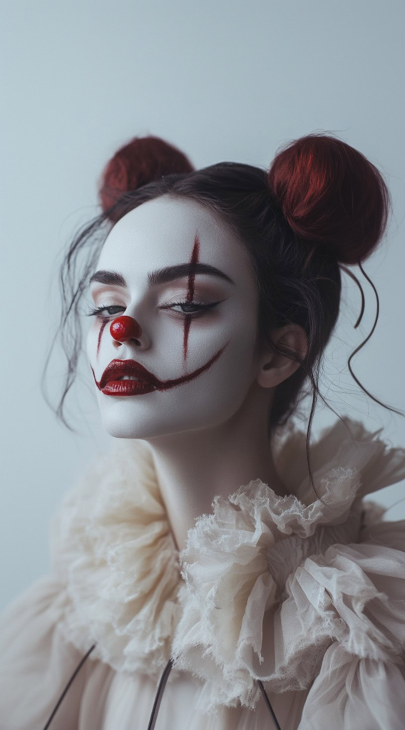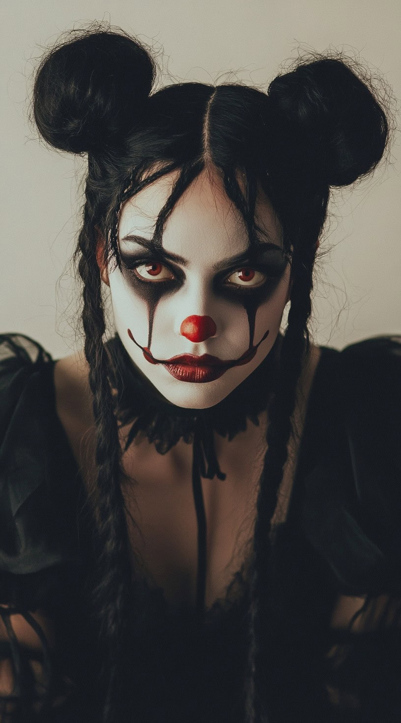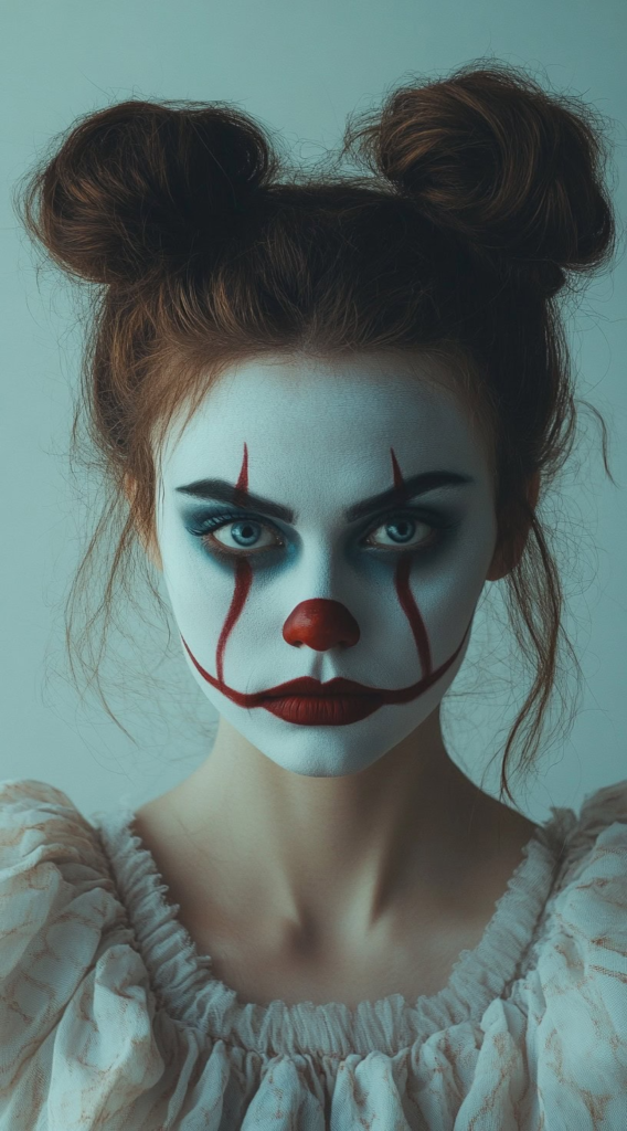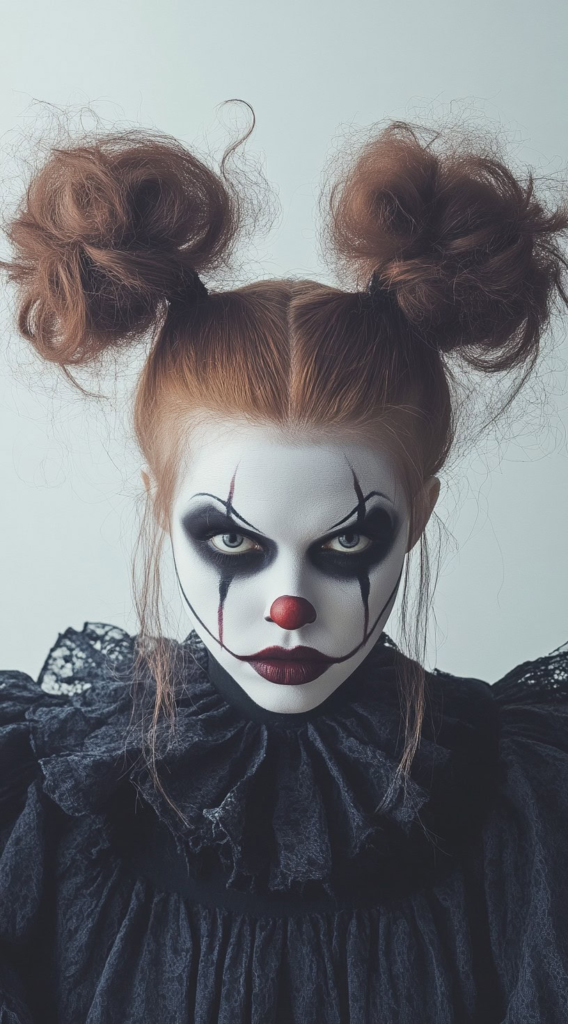 Sometimes the most effective looks are the simplest. Two dark buns paired with traditional red-and-white clown makeup needs no explanation. It’s instantly recognizable, low-maintenance, and works on almost any hair type and length.