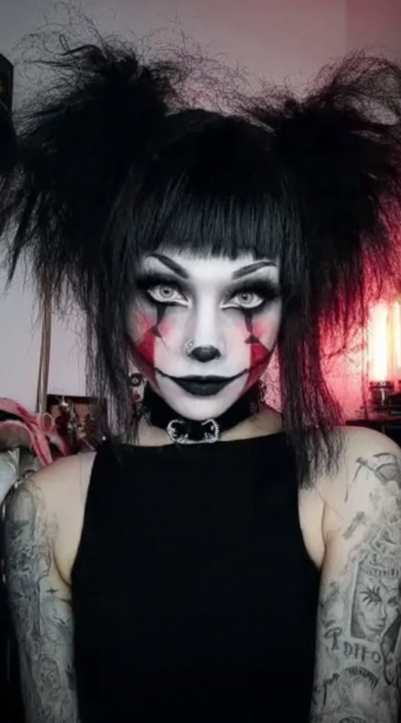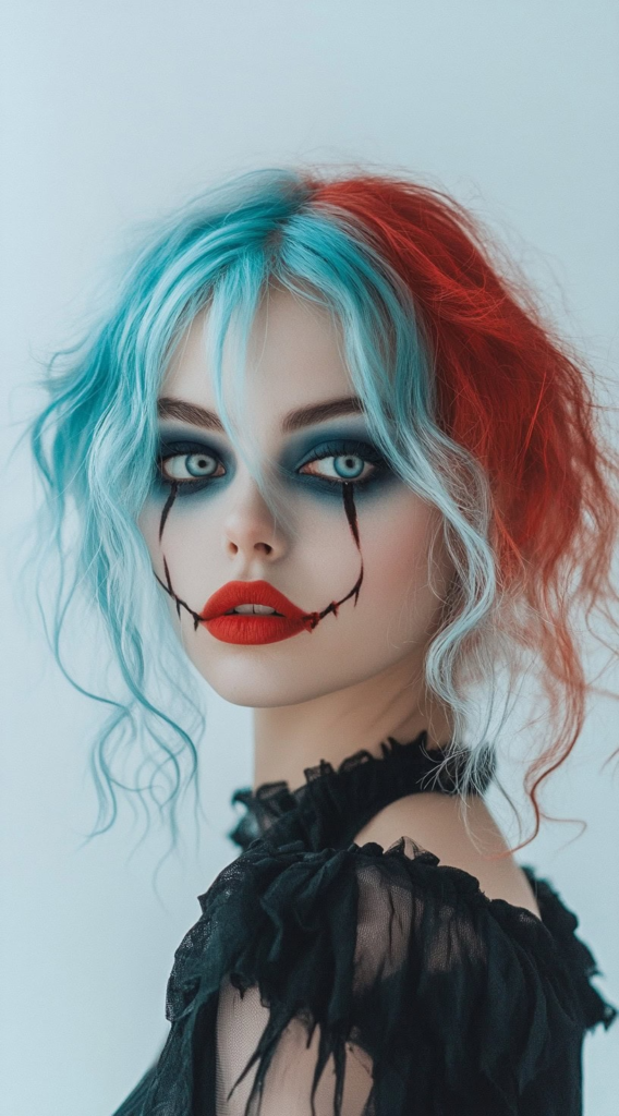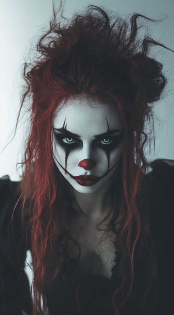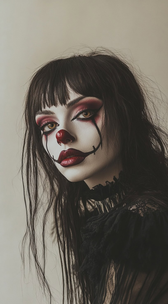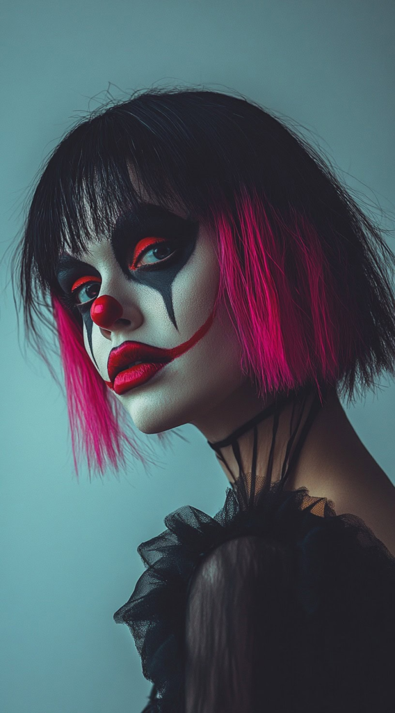 The gothic clown trend combines elegance with eeriness. Long, straight dark hair with blunt bangs creates a modern vampire vibe when paired with clown makeup. The bluntness of the bangs prevents the look from feeling romantic—it’s sharp and striking.