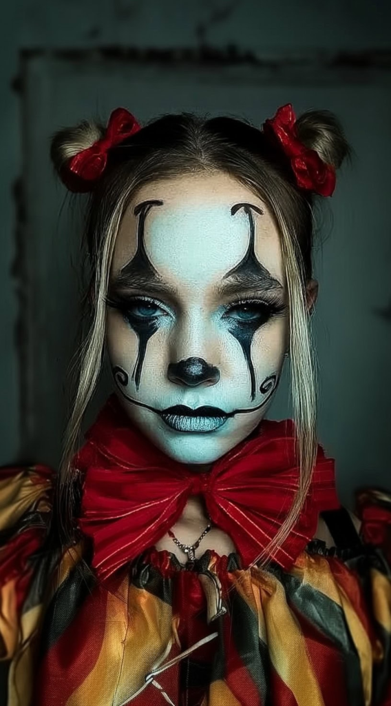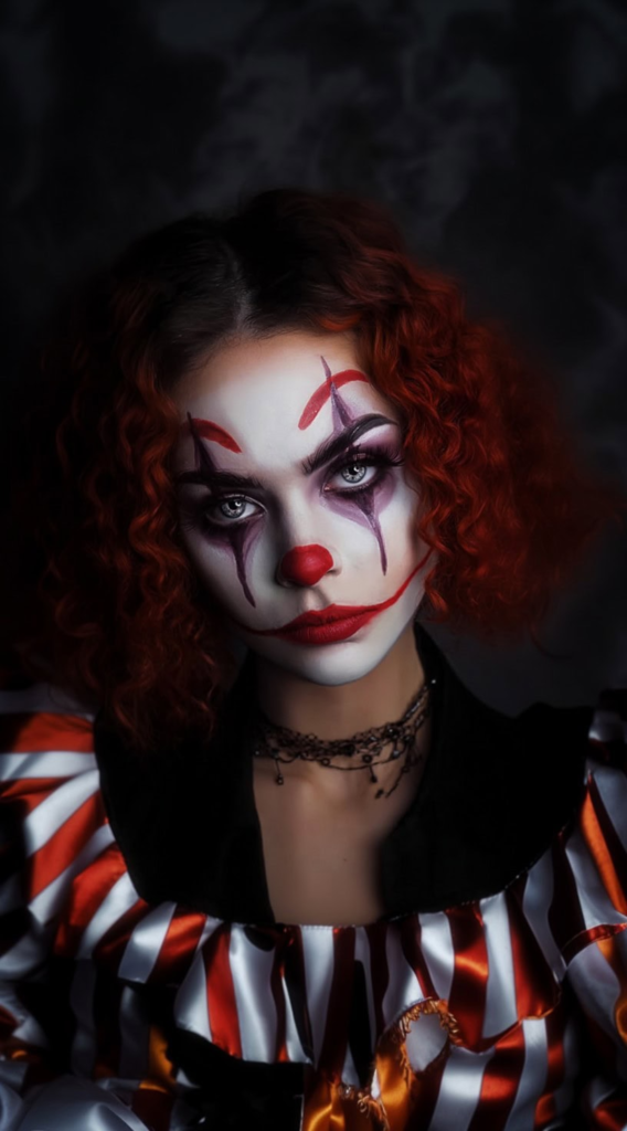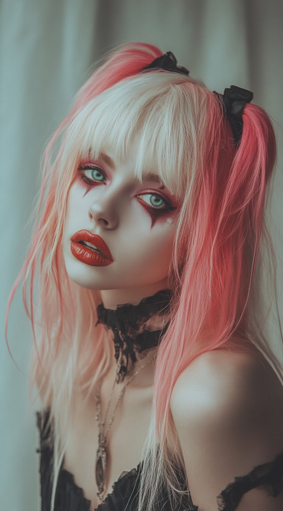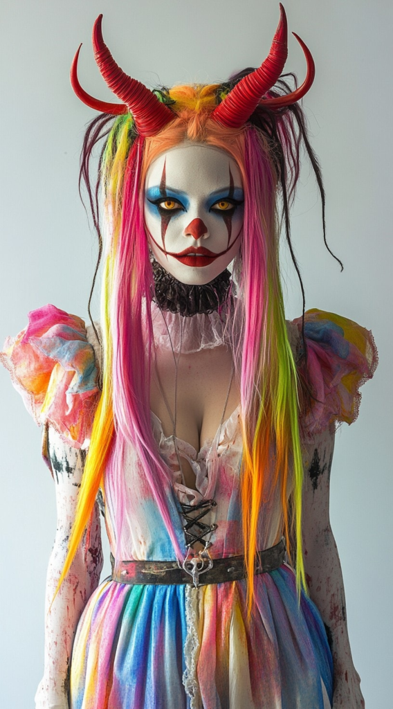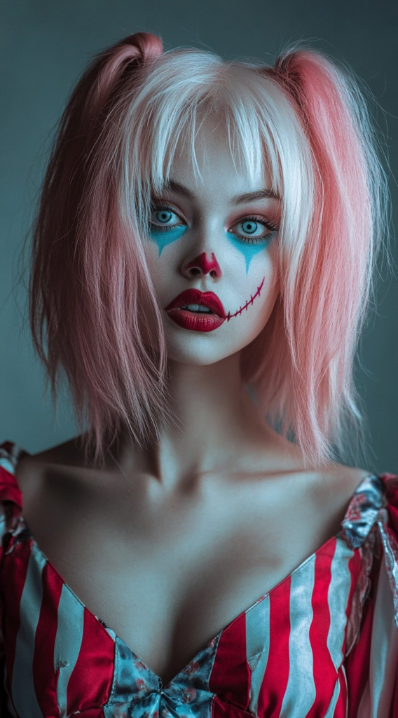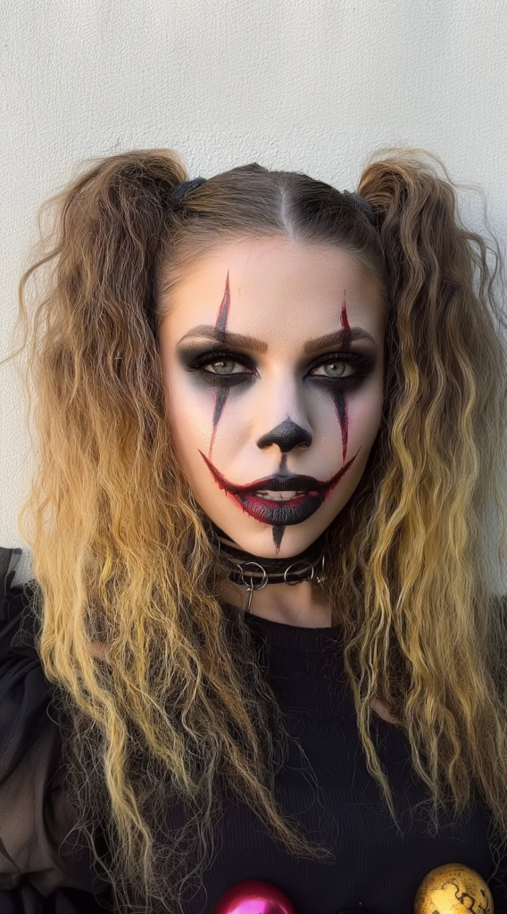The gothic clown trend combines elegance with eeriness. Long, straight dark hair with blunt bangs creates a modern vampire vibe when paired with clown makeup. The bluntness of the bangs prevents the look from feeling romantic—it’s sharp and striking.