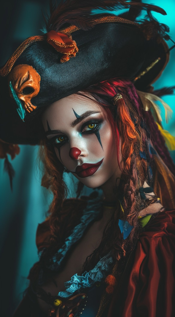 Blending costume themes creates memorable looks. This style combines classic clown hair with a pirate hat, merging two Halloween favorites. The neon strands and braids underneath the hat suggest creativity and commitment to the bit.