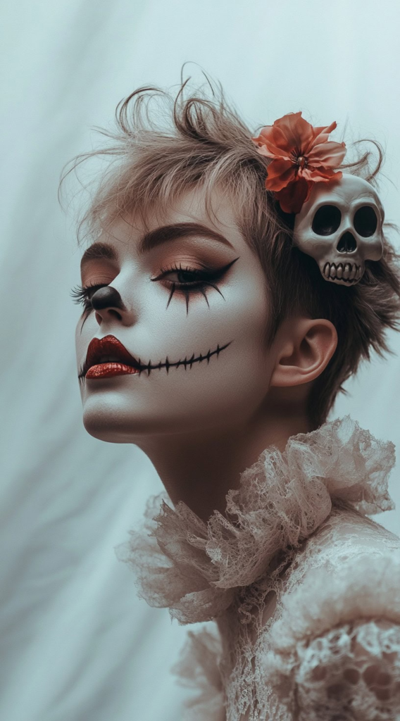 Short hair offers advantages that longer styles can’t. A pixie cut is inherently edgy and modern. When accessorized with skull and flower pieces, it creates juxtaposition—death imagery paired with life/bloom symbolism.