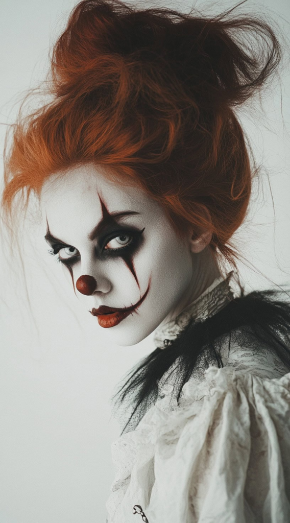 This is the power player option. A voluminous updo with fiery red hair creates drama and presence. The messiness suggests intentional chaos rather than carelessness, which is exactly what clown aesthetics require. The volume alone makes a statement before anyone even sees your makeup.