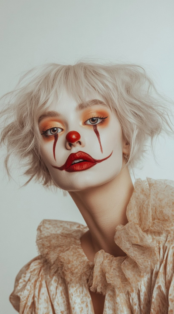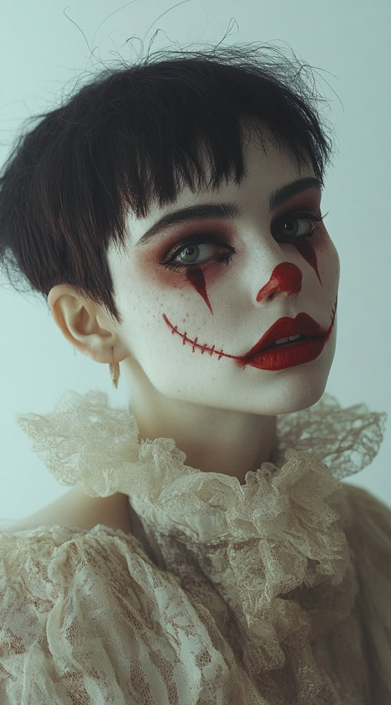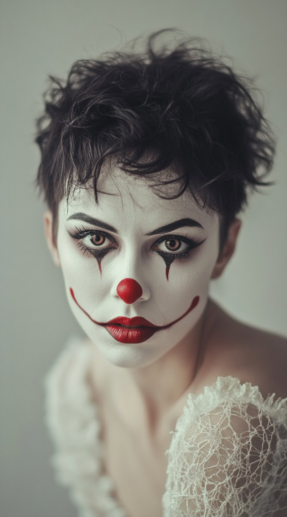 A short, dark pixie with heavy clown makeup creates sophisticated spookiness. The simplicity of the hairstyle lets the makeup become the statement. This appeals to people who love makeup artistry and want to showcase it.