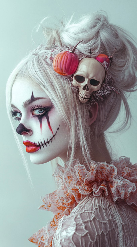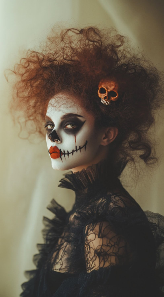 Elegant updos with costume accessories create a sophisticated Halloween look. The combination of sleek updo with playful skull and pumpkin pieces feels unexpected and deliberate. This appeals to people who don’t want to look like a caricature.