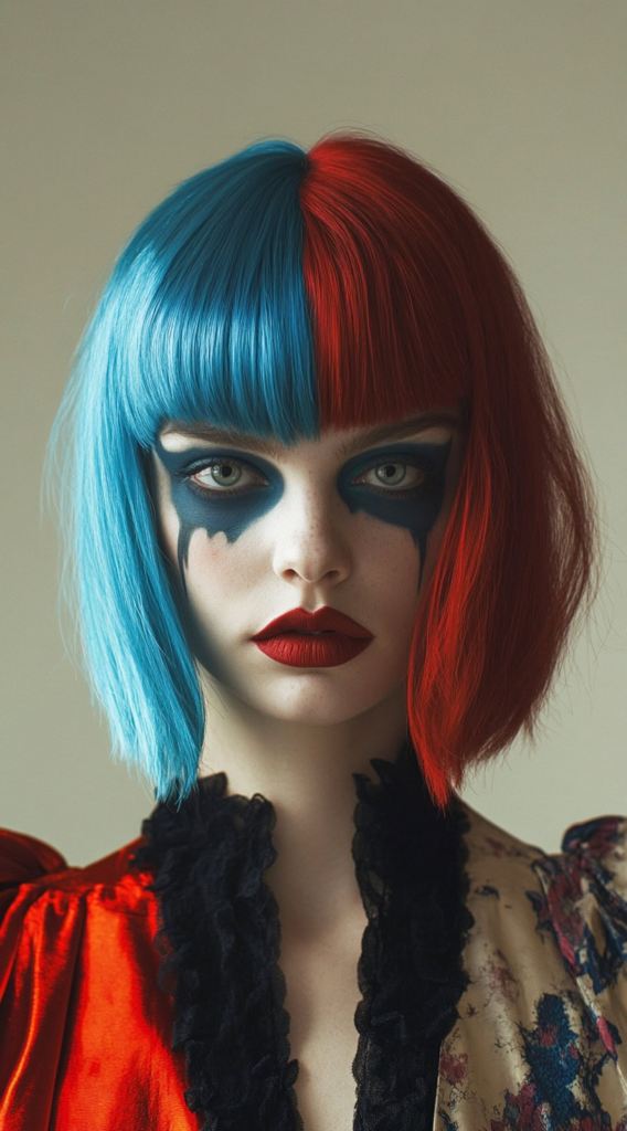 Split dye is an artistic statement. One side of the bob in one color, the other side in a contrasting color (typically blue and red) creates a modern, edgy vibe. V-shaped bangs add sharpness and geometric interest.