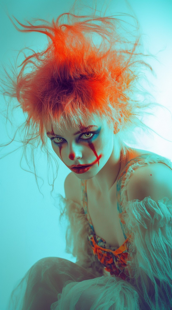 This style embraces chaos. A frizzy mane of bright red hair, teased and volumized to maximum capacity, creates the impression of untamed energy. It’s perfect for chaotic clown costumes where the look suggests something slightly unhinged.