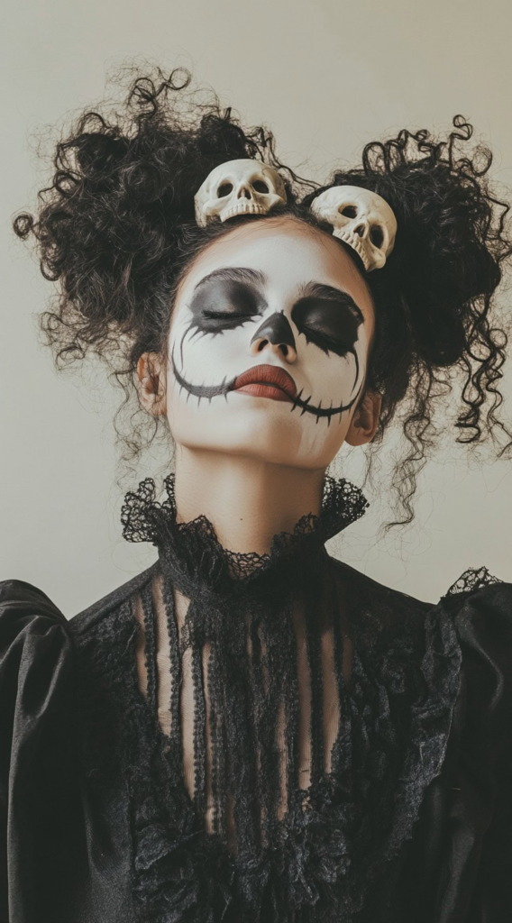 Dark curly hair styled into high buns with skeleton-themed accessories creates spooky elegance. The buns provide structure while curls add texture and movement. Skeleton accessories reinforce the Halloween theme without being obvious.