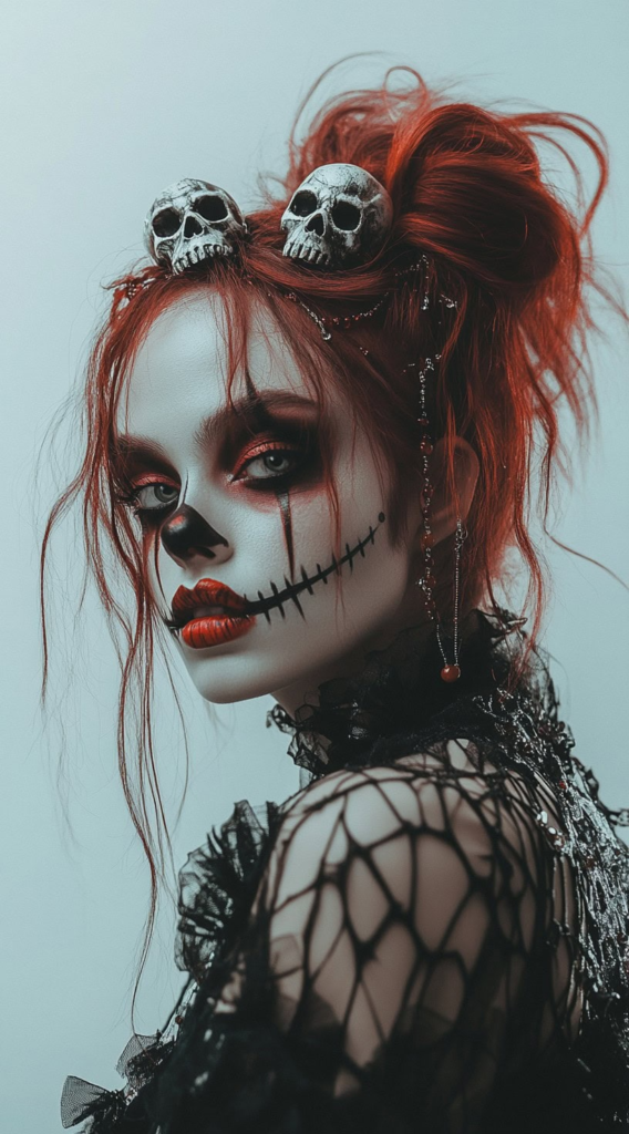 A dramatic updo with fiery red hair and skull accessories creates powerful presence. Red hair combined with skull imagery suggests danger and intensity. This style is for people who want to make an entrance.