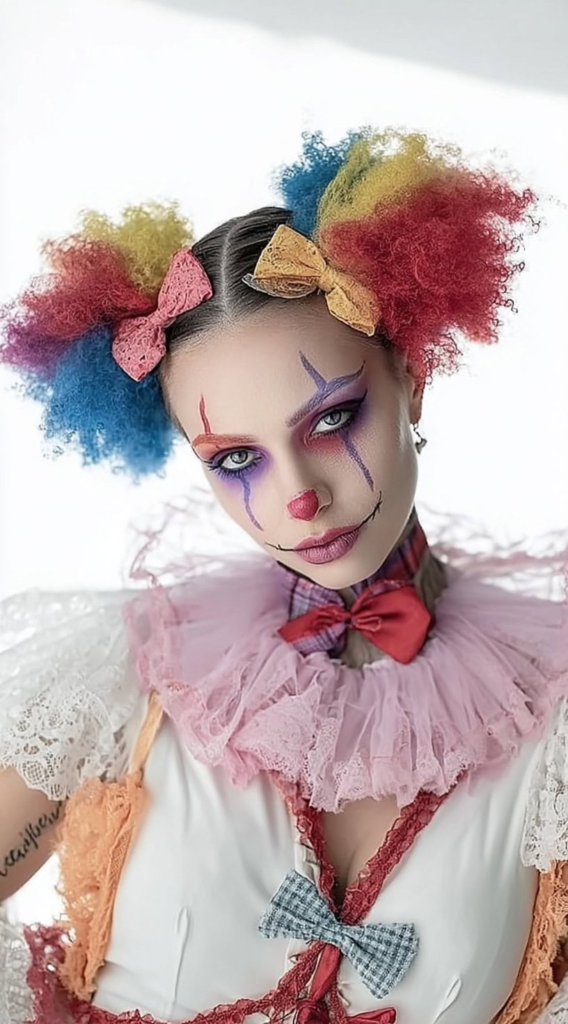 - Clown hairstyles work best when paired with complementary makeup and costume elements