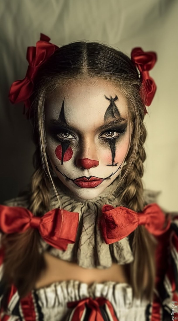 Neat braids with red bows and nostalgic makeup create haunted carnival vibes. The braids keep hair organized while the vintage makeup tells the story. This approach prioritizes makeup artistry.