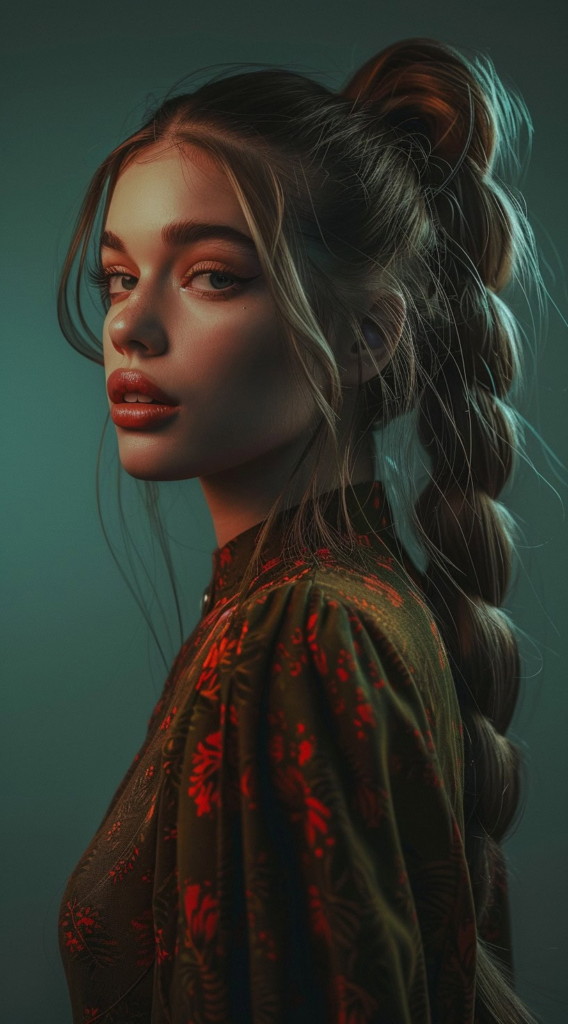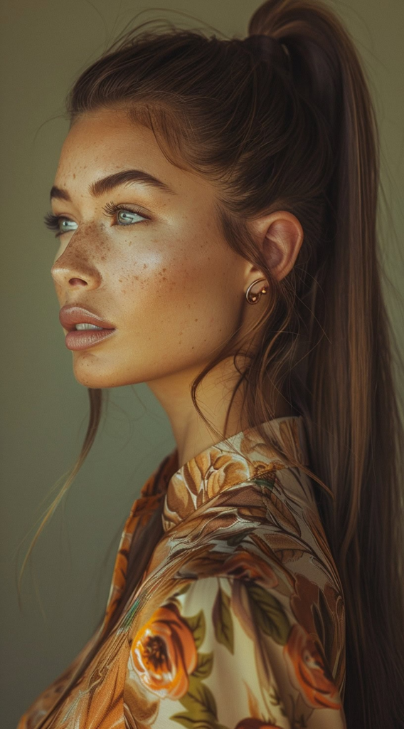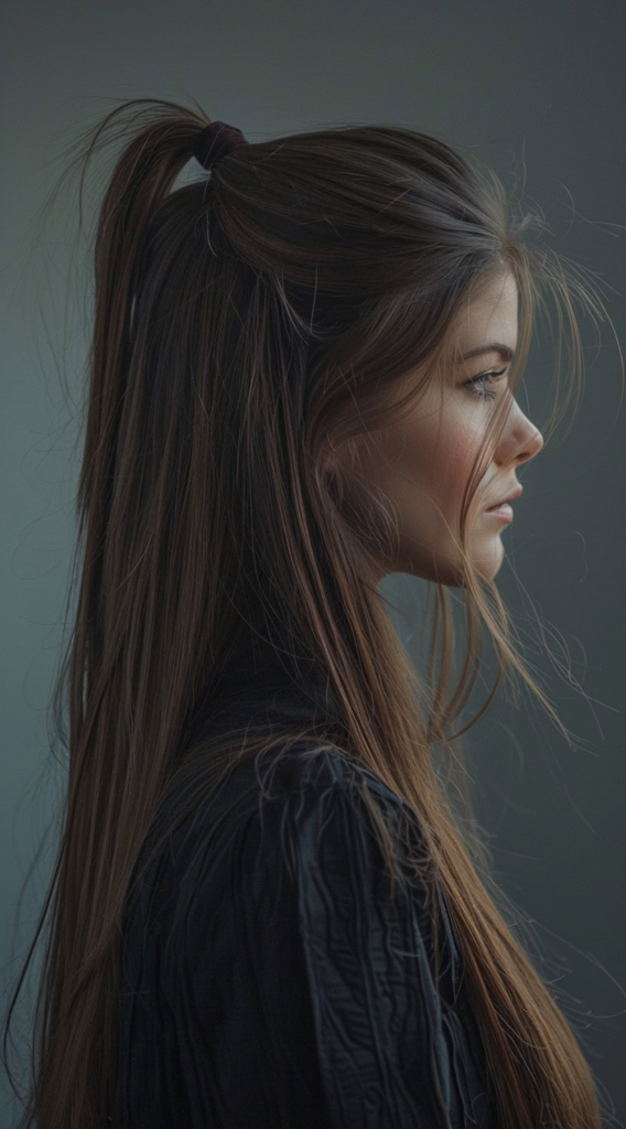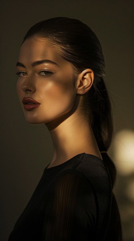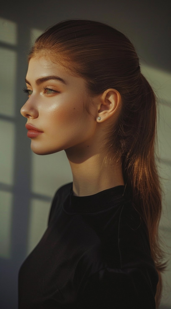 This ponytail looks polished and structured. I divide it into sections to add detail without making it complicated. A light hairspray keeps everything in place for hours.