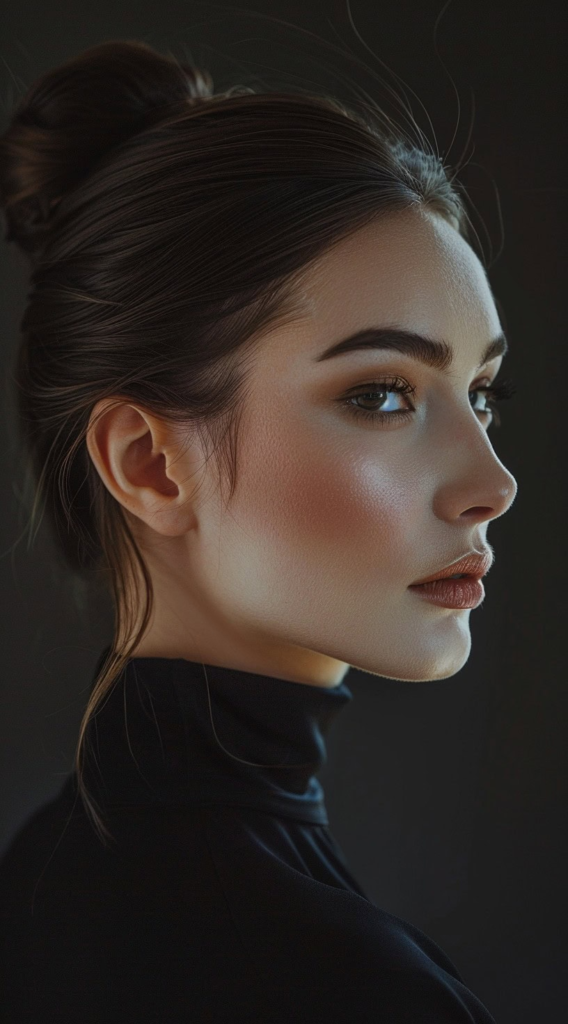 This bun adds height and structure to the look. The loose strands in front help soften the overall appearance. I make sure the sides stay smooth for a polished finish.