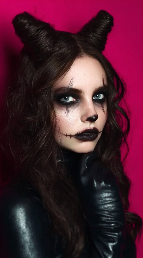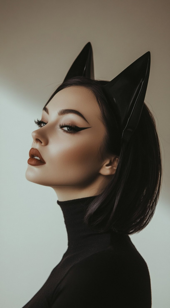 A sleek bob paired with a cat ears headband is one of the most underrated Halloween combinations out there. The clean lines of the cut frame the face sharply, and the headband does all the costume heavy lifting. This works particularly well on straight hair textures that hold shape without much product.