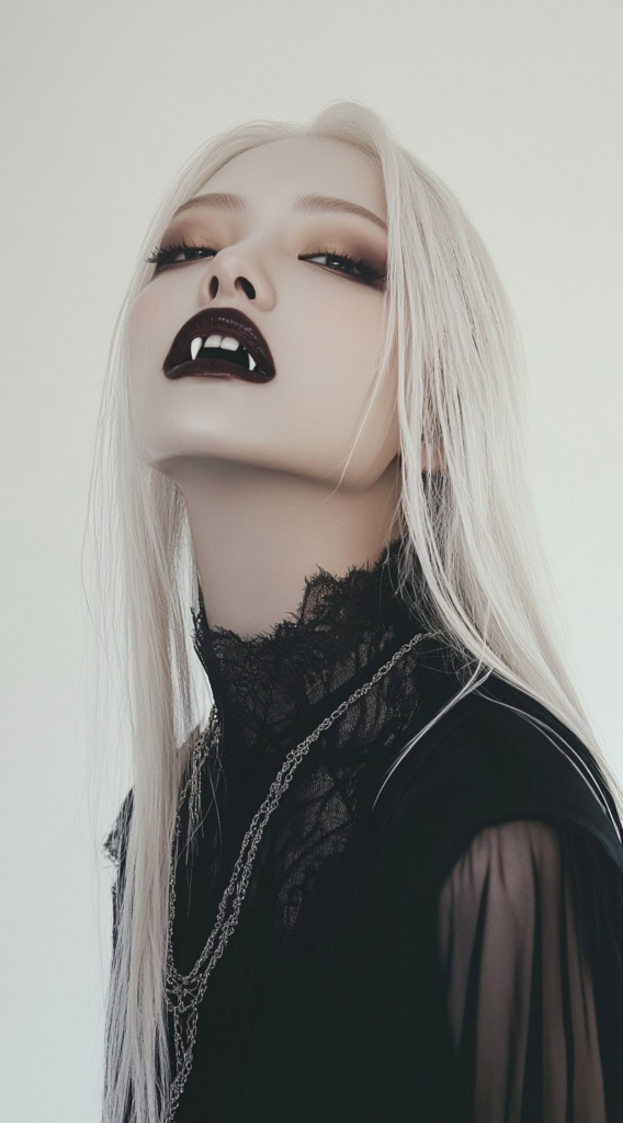 Vampire aesthetics remain one of the top Halloween costume categories year after year. Long, straight hair with a sharp middle part captures that cold, aristocratic vampire energy immediately. White-blonde or ash tones intensify the effect dramatically.