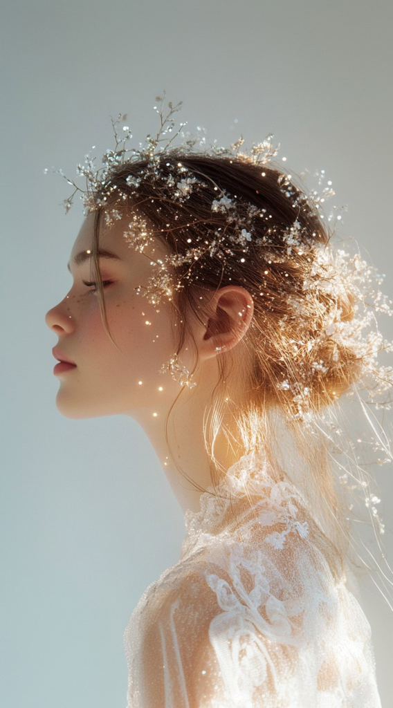 A soft low updo scattered with glitter and delicate flowers reads as ethereal without being overly complicated to execute. Medium to long hair lengths handle this style best. The key is keeping the updo relaxed rather than stiff loose, romantic, and slightly undone is the goal.