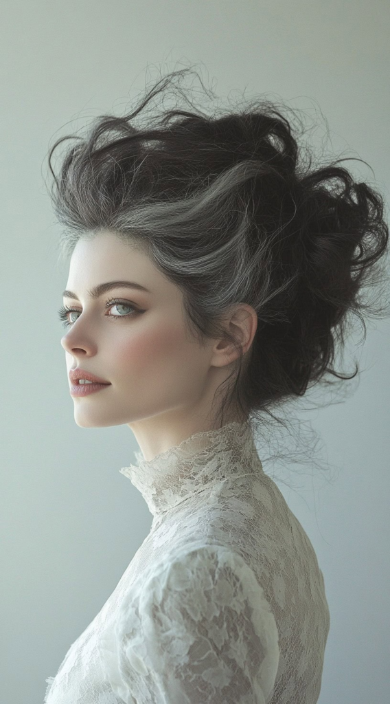 6. Frankenstein’s Bride Voluminous Updo with White Streaks