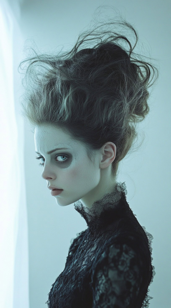 One of the most recognizable Halloween hairstyles in existence. The towering updo with bold white streaks is instantly iconic and requires zero explanation at a costume party. Thick hair types achieve the best natural volume here, though extensions can help boost the height.