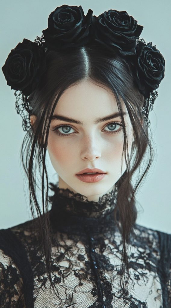 8. Gothic Princess Sleek Middle-Parted Hair with Black Rose and Lace Accessories