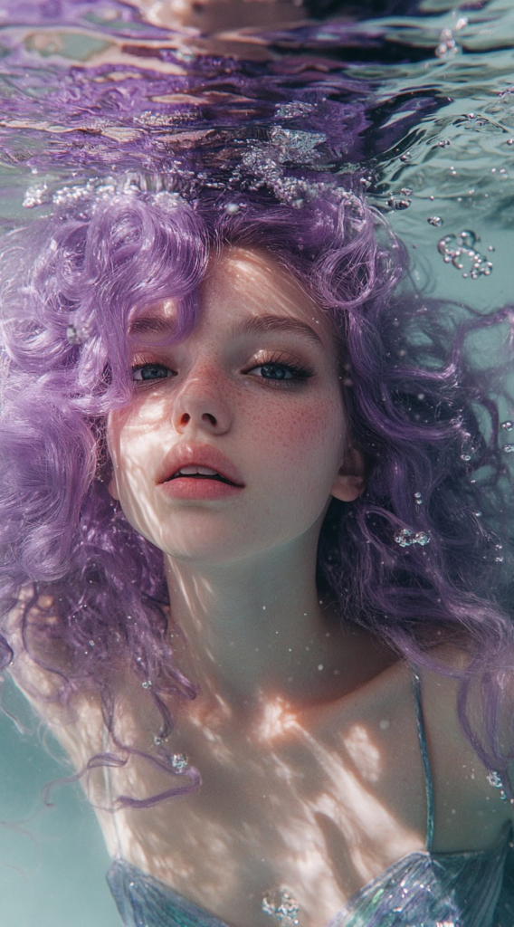 Purple-toned hair consistently ranks among the most searched Halloween color choices every October. Loose waves in a deep violet or lavender hue immediately suggest an underwater fantasy world. Naturally wavy hair types get the most effortless version of this look.