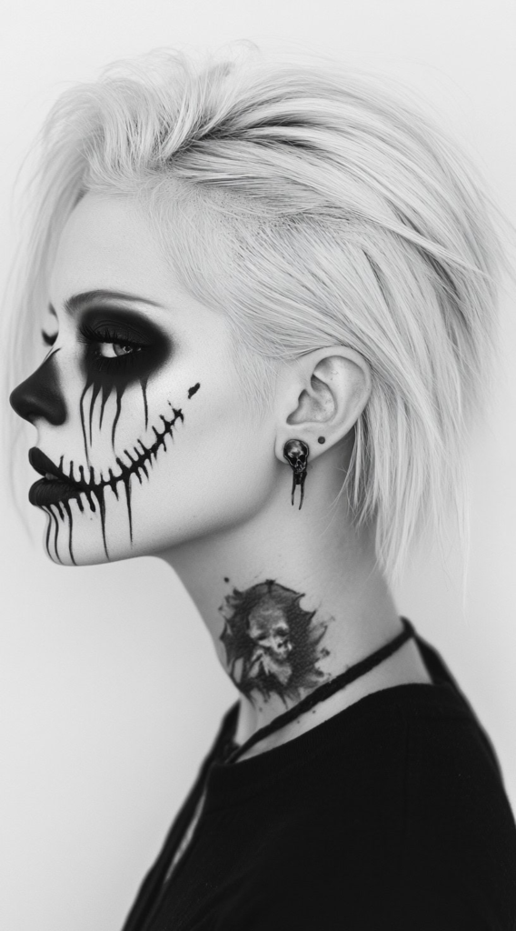 Skeleton makeup paired with a polished, tucked bob creates an interesting contrast the precision of the hair against the graphic starkness of the face paint. This works particularly well for those who prefer their Halloween costume to feel current and fashion-forward rather than theatrical.