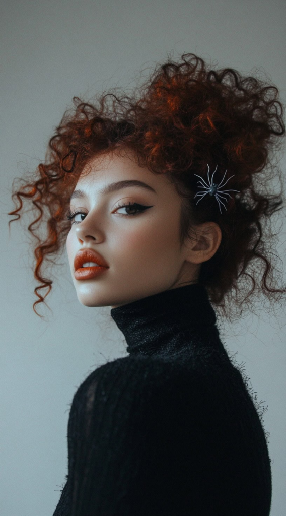 Curly hair absolutely shines in this style the natural volume creates a dramatic crown of texture that flat hair simply cannot replicate. Small plastic spider accessories tucked throughout the curls add a creepy element without requiring any additional styling tools.