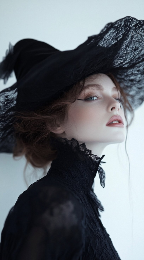 Victorian witch aesthetics continue gaining traction in 2026, driven largely by dark academia and cottagecore crossover trends. A softly waved updo beneath a traditional witch hat has historical accuracy while still feeling refined and intentional rather than cheaply costumed.