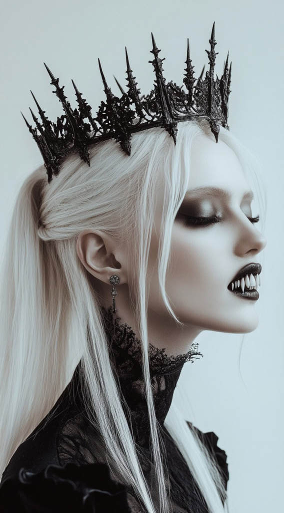 Platinum blonde hair carries an inherently cold, otherworldly quality that suits vampire aesthetics perfectly. A half-up style topped with a gothic crown is regal without requiring advanced styling skills. This look performs particularly well on naturally straight or slightly wavy textures.