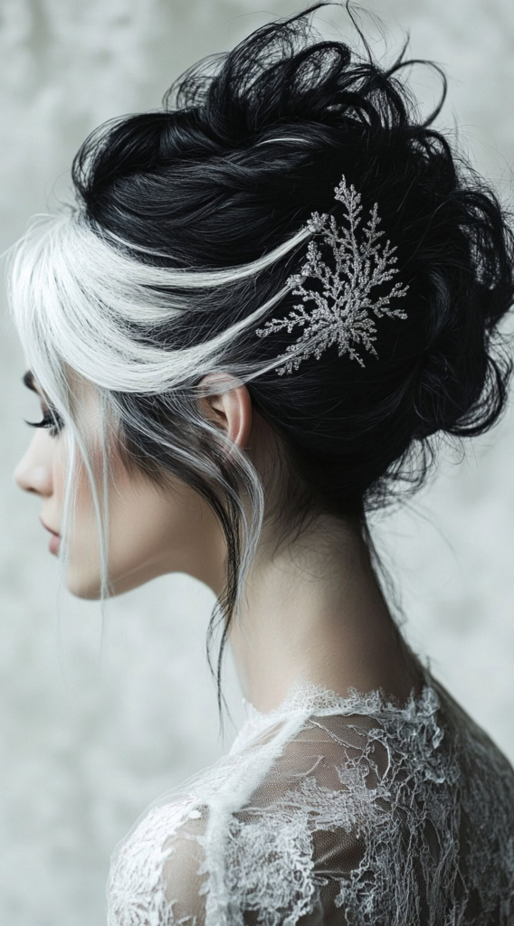 21. Winter Queen Updo with Platinum Blonde Streaks and Snowflake Hair Accessories
