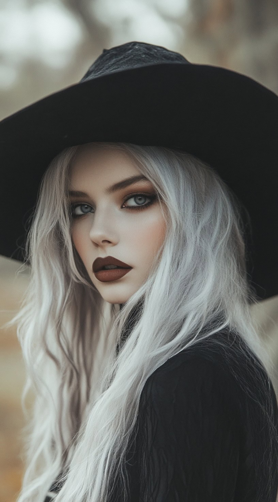 Icy white waves against dark, dramatic makeup create one of the most cinematically striking Halloween looks on this list. The key is keeping the waves soft and slightly frayed rather than structured — polished waves look bridal; undone waves look haunted.