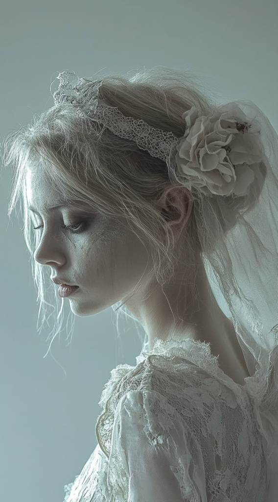 The zombie bride is a Halloween perennial for good reason it takes universally flattering bridal styling and adds a horror-movie edge. A deliberately disheveled updo scattered with traditional bridal accessories creates a compelling visual tension between elegance and decay.