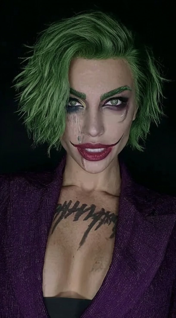 Few Halloween hairstyles communicate character as immediately as a choppy green bob. The rough layering and uneven texture are intentional controlled chaos is exactly the aesthetic this look is going for. It translates well beyond strict Joker costumes into any villain or anarchist character type.