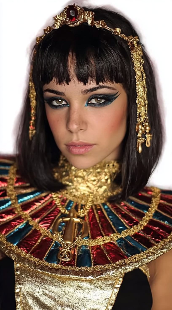 The jet-black blunt bob with sharp fringe is one of Halloween’s most enduring looks because it flatters a genuinely wide range of face shapes. Gold accessories and strong winged liner complete the transformation effectively. The commanding, regal quality of this style comes entirely from the precision of the cut and the opacity of the color.