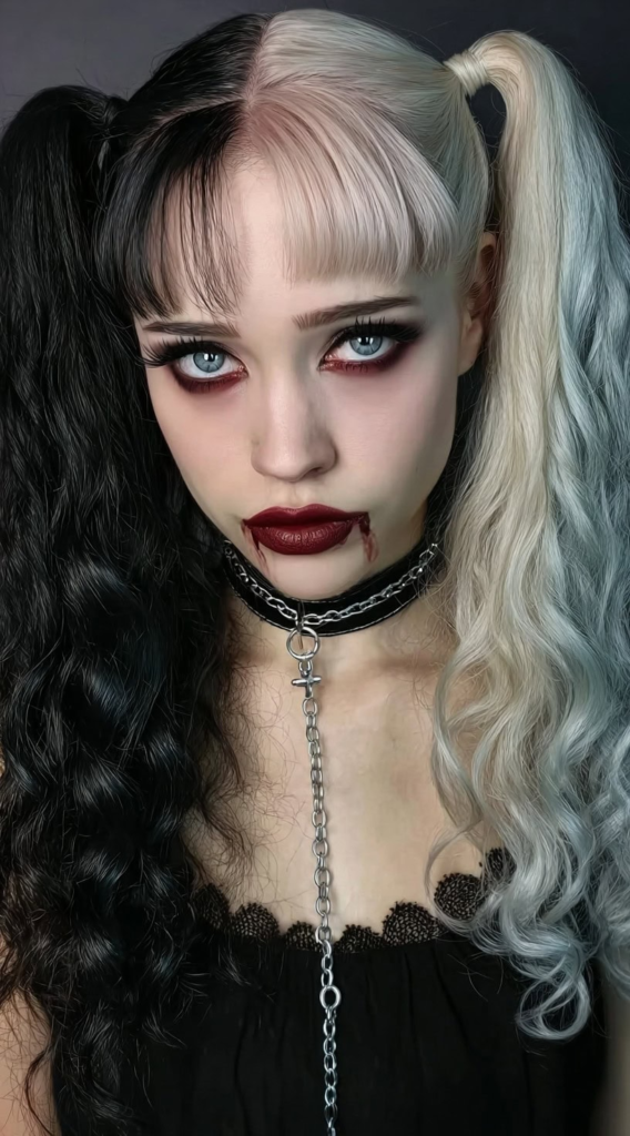 Split-dye aesthetics have seen enormous growth in popularity through 2025 and into 2026. The half-black, half-platinum curly pigtail combination is bold, expressive, and immediately communicates the vampirecore aesthetic without requiring any additional costume elements to be recognizable.