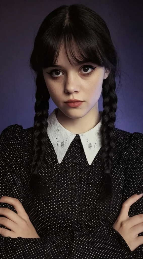 Wednesday Addams remains a cultural touchstone, particularly following the 2022 Netflix series that drove costume searches up over 200% and sustained that interest well into 2026. Tight braids with soft curtain bangs offer a slightly modernized version of the original character styling.