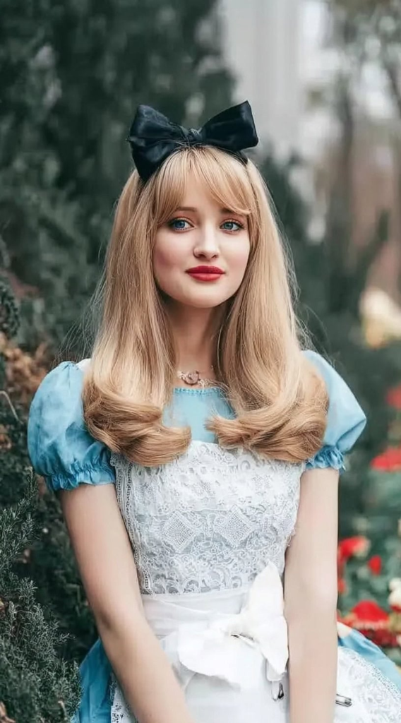 30. Alice in Wonderland-Inspired Vintage Doll Hair with Soft Curls and Bangs