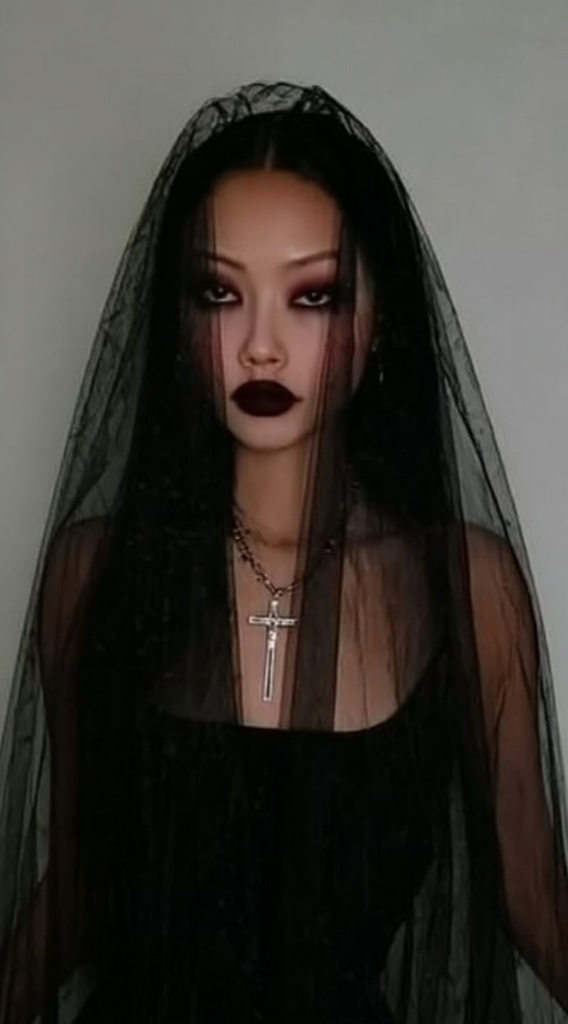 Straight hair pulled back cleanly, paired with black roses and lace detailing, creates a look that’s sophisticated rather than cartoonish. This is a strong choice for anyone who prefers their Halloween aesthetic to lean elegant and moody over overtly spooky.