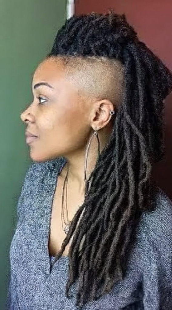 I like how this style balances bold and soft elements. The side-swept locs frame the face while the undercut adds contrast.