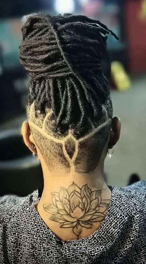 11. High Bun Locs with Shaved Design