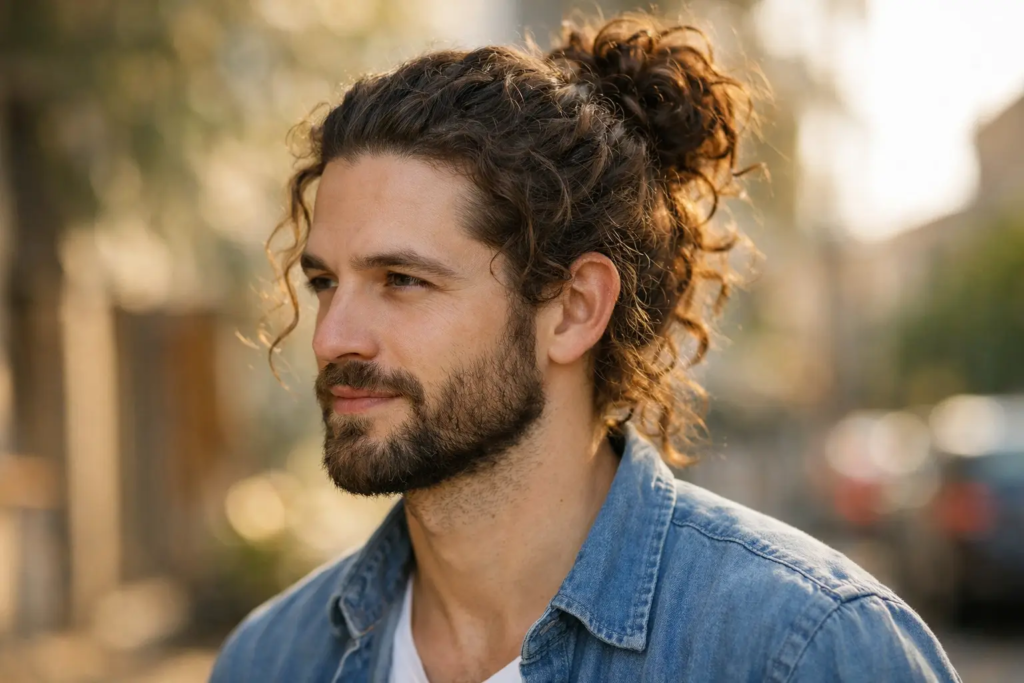 The curly man bun is practical and clean when needed. It keeps hair controlled while still showing natural texture.