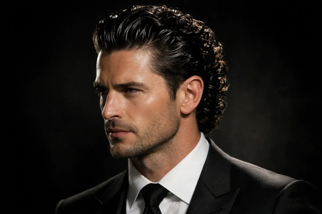The curly quiff focuses on volume at the front but keeps it softer than a pompadour.