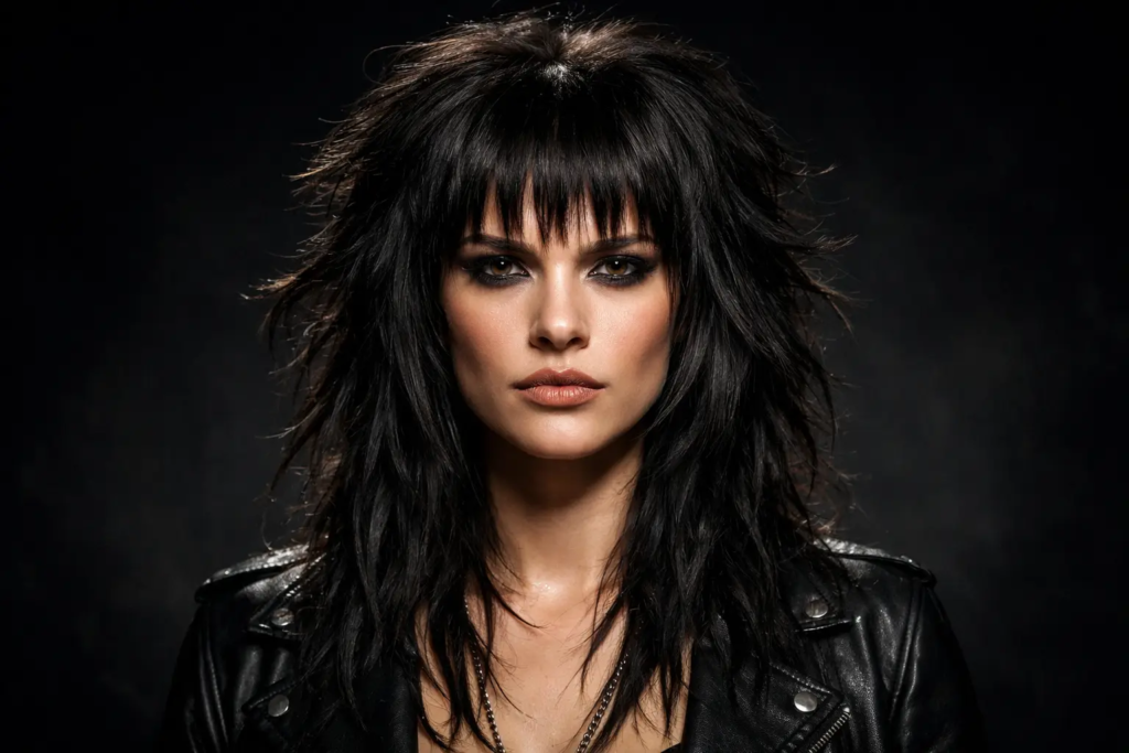 Choppy bangs give a more edgy look. They blend with the layered crown.