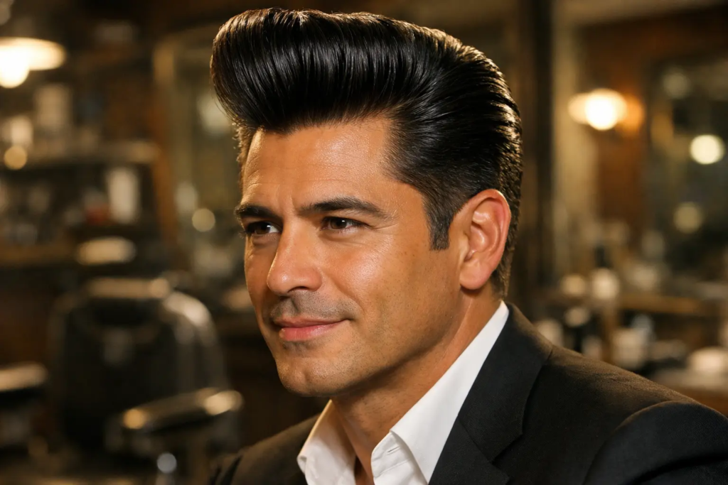 The classic pompadour is still one of the strongest styles for thick hair. It uses natural density to create a clean lift at the front with smooth sides. From experience, this version works best when hair is at least 4–5 inches on top.