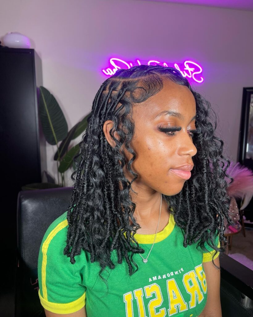 Curls bring volume and movement to short locs. This style suits most face shapes. Keeping curls hydrated reduces frizz, which is a common issue.