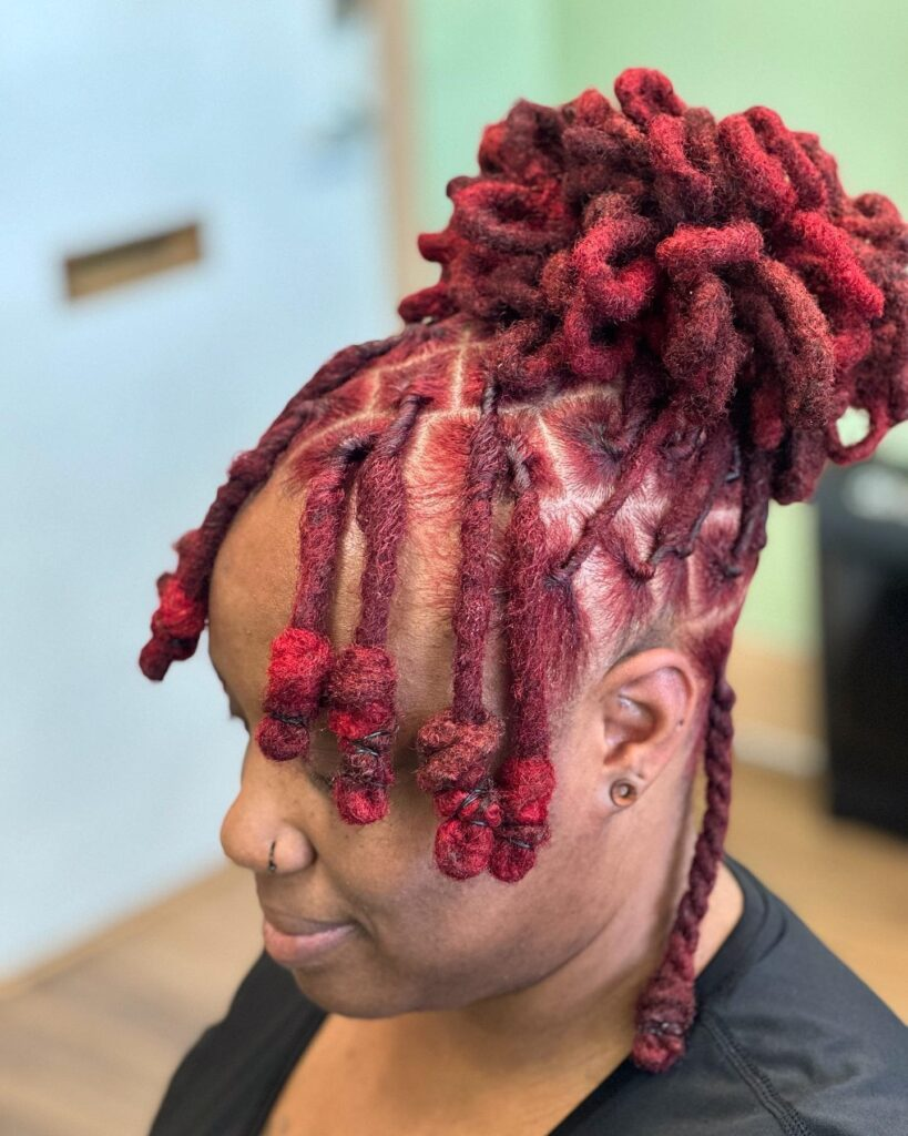 Red locs are bold and eye-catching. From experience, color like this fades faster, so regular touch-ups are needed.