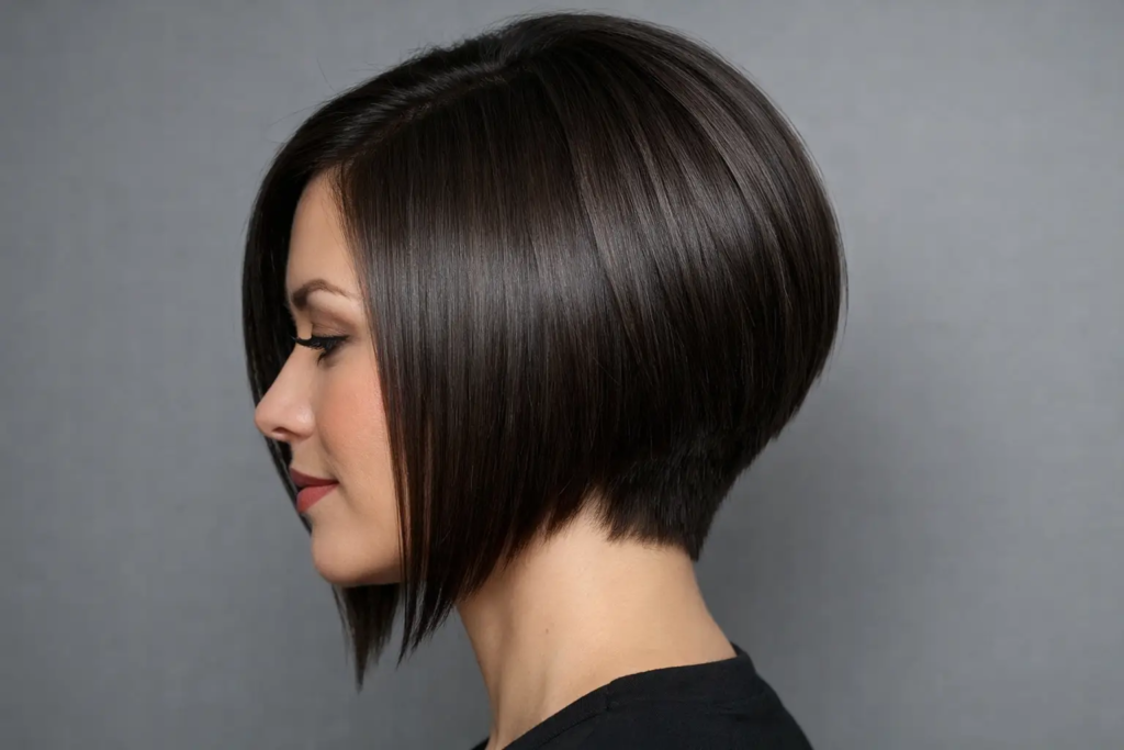 A short stacked bob focuses volume at the crown. It’s practical and easy to maintain, especially for busy routines.