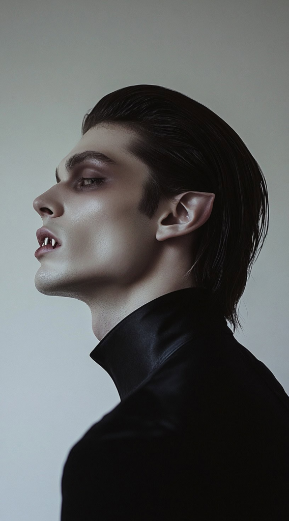 The slicked-back widow’s peak is the single most iconic vampire hairstyle in horror film history, appearing in representations of the character across nearly a century of cinema. The widow’s peak draws focus to the forehead and creates a naturally haunting facial silhouette. This suits elongated or strong-cheeked face shapes particularly well.