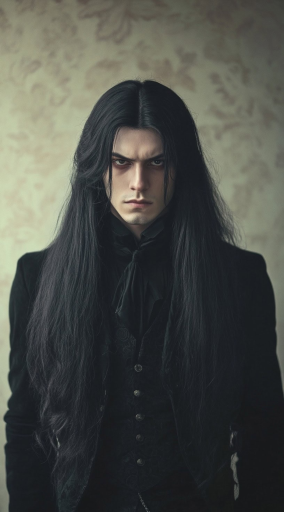 Long, perfectly straight, shiny black hair is one of the most classically cinematic vampire looks for men — it appears in vampire films across decades for good reason. The style works entirely through simplicity and condition. The hair needs to look genuinely healthy and reflective to carry the aesthetic.