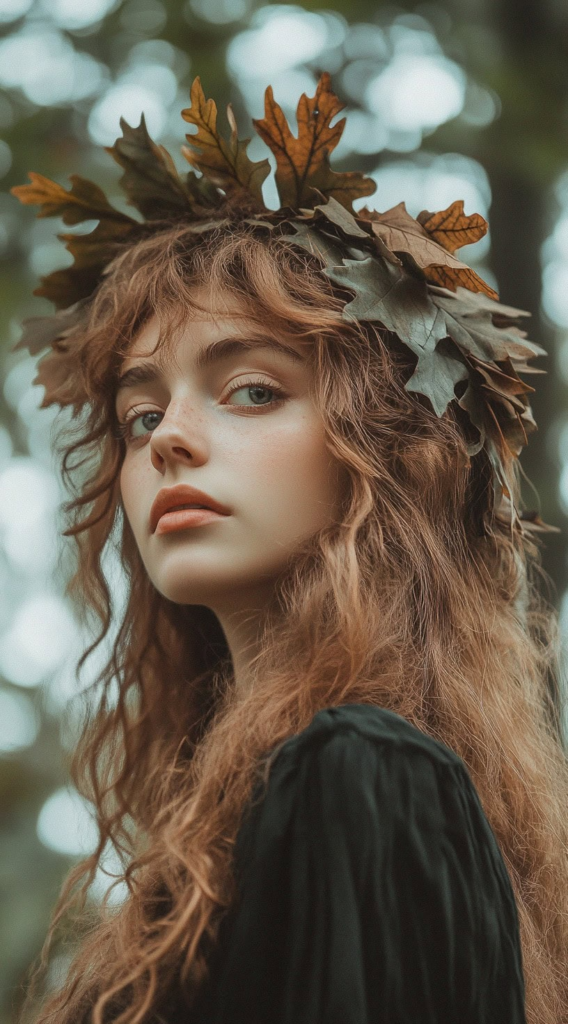 Loose waves, face-framing bangs, and leaf accessories placed throughout the hair create a witch hairstyle that feels genuinely rooted in nature. This look works best when the accessories feel organic — real or high-quality faux leaves make a significant difference over obviously plastic ones.